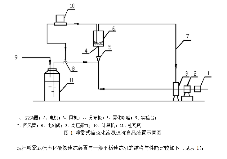 噴霧式流態(tài)化液氮速凍裝置就簡單得多(圖1),不需要壓縮機及蒸發(fā)器,冷凍裝置的致冷劑采用液氮噴淋汽化后提供,汽化氮氣在風(fēng)管內(nèi)循環(huán)使用以提高冷量的利用率,它主要由離心式風(fēng)機、風(fēng)管、布風(fēng)板、變頻器、噴嘴、杜瓦瓶、高壓氮氣瓶以及計算機數(shù)據(jù)采集系統(tǒng)和處理系統(tǒng)組成。風(fēng)機的轉(zhuǎn)速由變頻器輸出不同頻率的電流來實現(xiàn)對風(fēng)機的無級調(diào)速。風(fēng)機吹出的氮氣經(jīng)導(dǎo)流后進(jìn)入到布風(fēng)板的下方,與從杜瓦瓶壓出經(jīng)噴嘴霧化的霧狀液氮混合后,再通過布風(fēng)板,把放在布風(fēng)板上的食品吹起。低溫混合氣體與食品充分熱交換后溫度升高,**后經(jīng)管道返回風(fēng)機,完成一次循環(huán)。冷凍食品的冷量由液氮來提供,通過調(diào)節(jié)液氮的噴量來調(diào)節(jié)冷風(fēng)的溫度,能滿足不同介質(zhì)溫度的要求。計算機數(shù)據(jù)采集系統(tǒng)主要由溫度傳感元件(銅-康銅熱電偶)、A/D模數(shù)轉(zhuǎn)換器、信號放大器、壓力傳感器、風(fēng)速儀以及高性能計算機等組成。溫度由熱電偶傳送到信號放大器,放大后的電信號進(jìn)入A/D模數(shù)轉(zhuǎn)換器轉(zhuǎn)換成數(shù)碼信號后進(jìn)入到計算機并口錄入溫度值。同樣裝置的壓力由壓力傳感器變?yōu)殡娦盘柦?jīng)放大器、A/D模數(shù)轉(zhuǎn)換器后進(jìn)入計算機錄入壓力值。熱風(fēng)速儀采集風(fēng)速后經(jīng)輸出口輸出到計算機。
